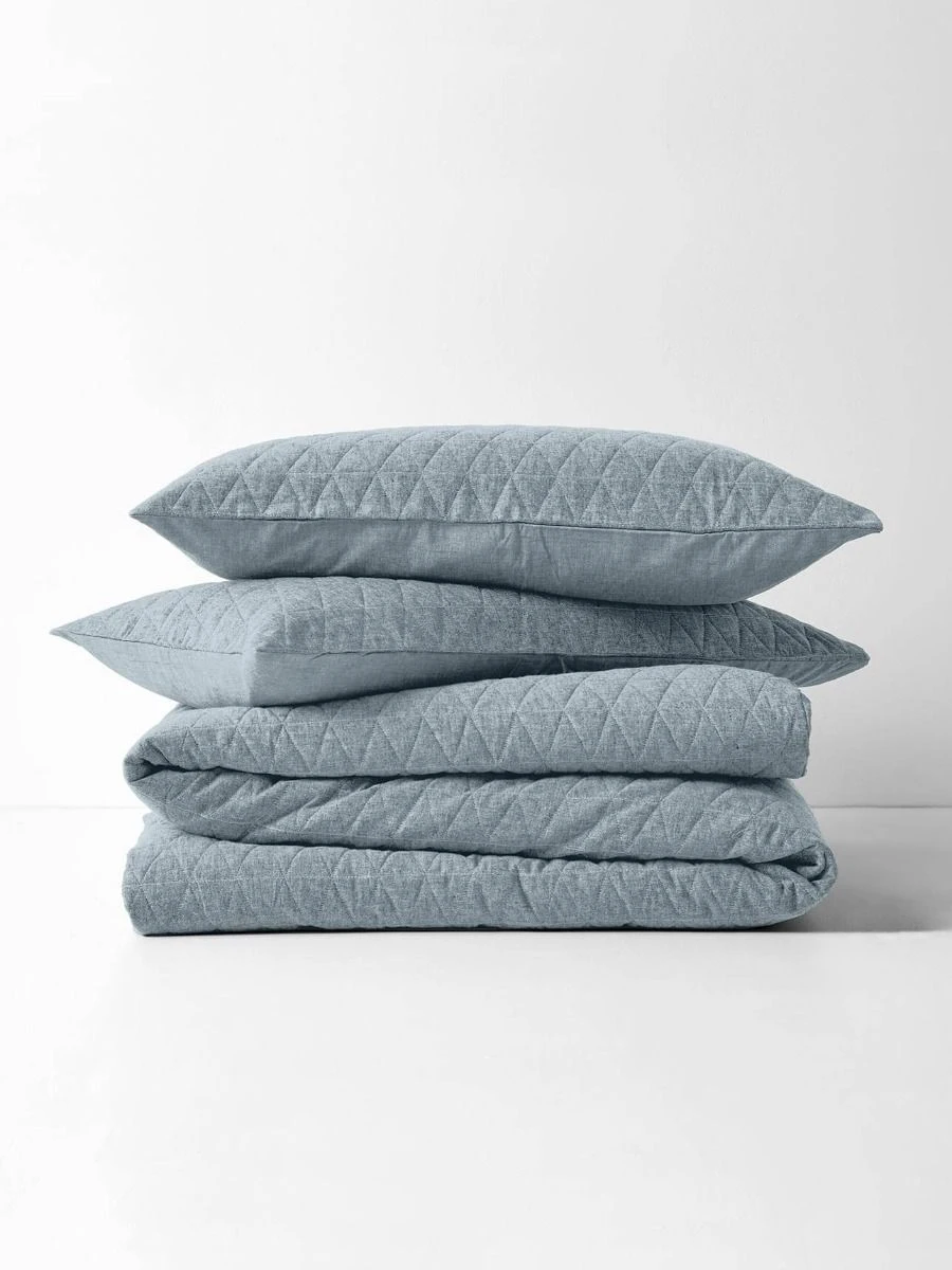 Pre-washed to achieve its tactile, vintage charm, the Chambray Quilted Quilt Cover in Bluestone is the pinnacle of luxury and comfort. Not only wonderfully warm in winter, but also doubles as a bed cover during summer.