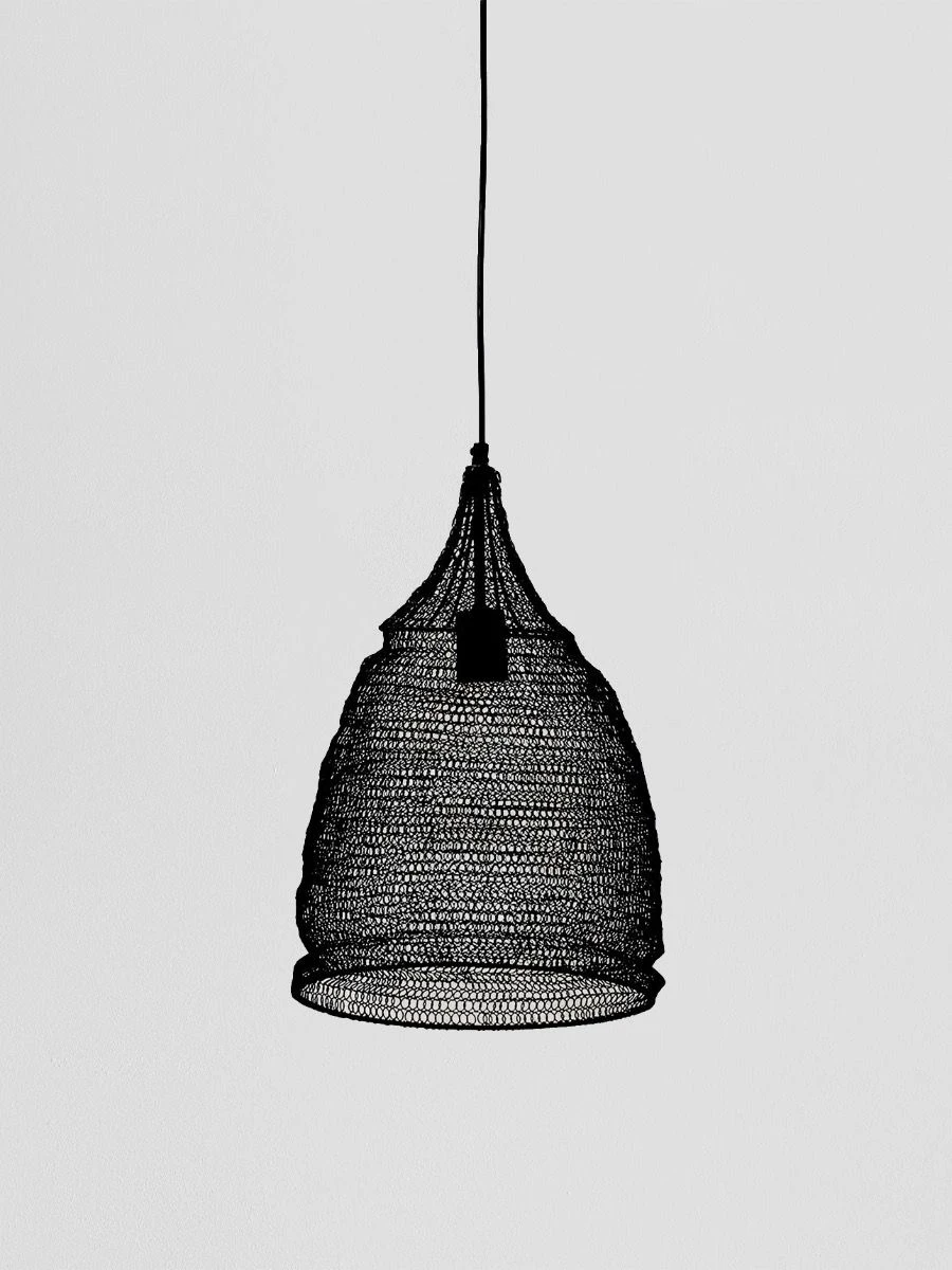 Modern Crochet pendant lights which have been hand crafted in India. Skilled artisans twist wire mesh into a crochet pattern to create this unique light fitting. Hence no two are exactly alike. Perfect as a statement on their own or hanging in groups, they are beautiful and unique, creating a wonderful light effect through the mesh. As the pendants have been hand made they are best to let hang to enable them to create their own shape. Available in Matte Gold and Black. Requires installation by a qualified electrican.