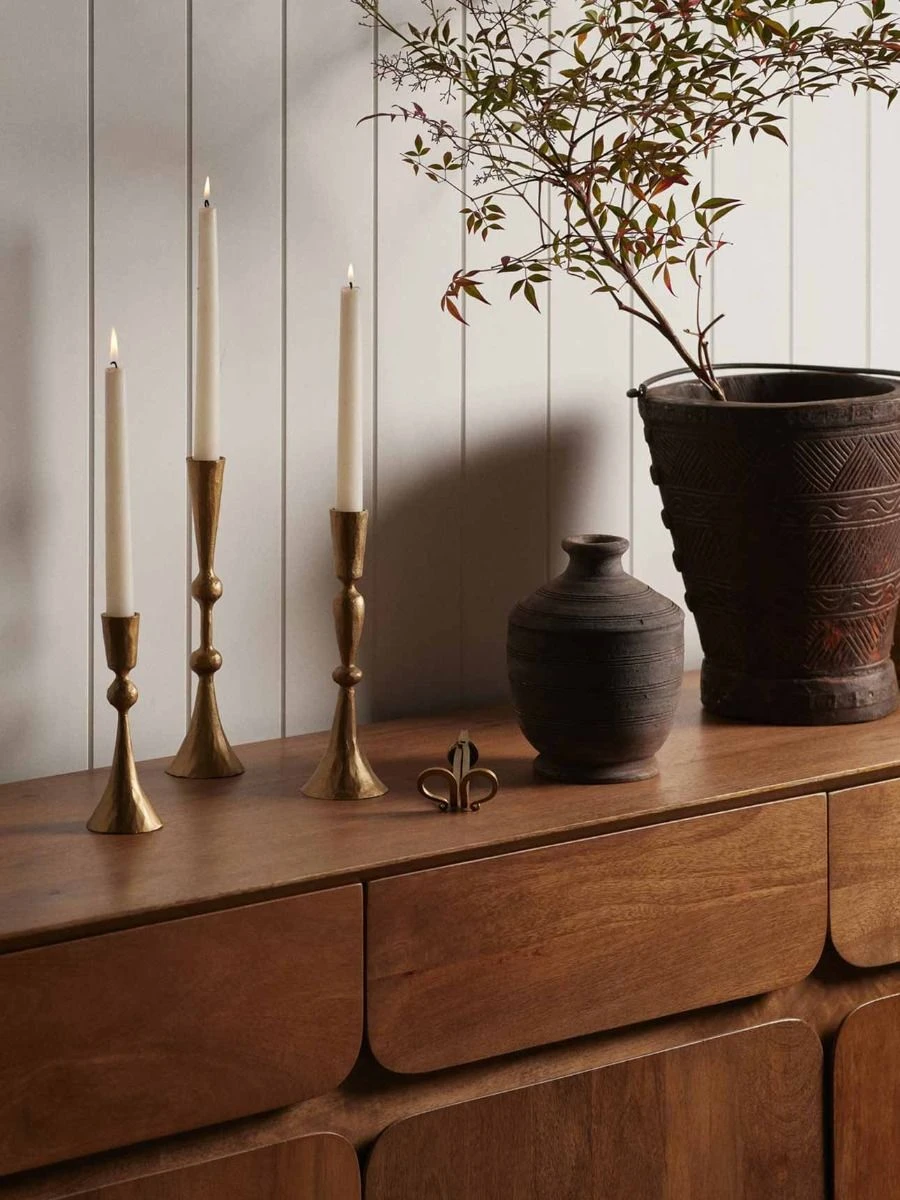Available in two sizes – the Enchantress Candle Stand offers versatility in styling. Create a captivating vingette by displaying both sizes together atop a sideboard or dining table, or let each candle stand shine individually in different rooms, setting an enchanting ambiance throughout your home.