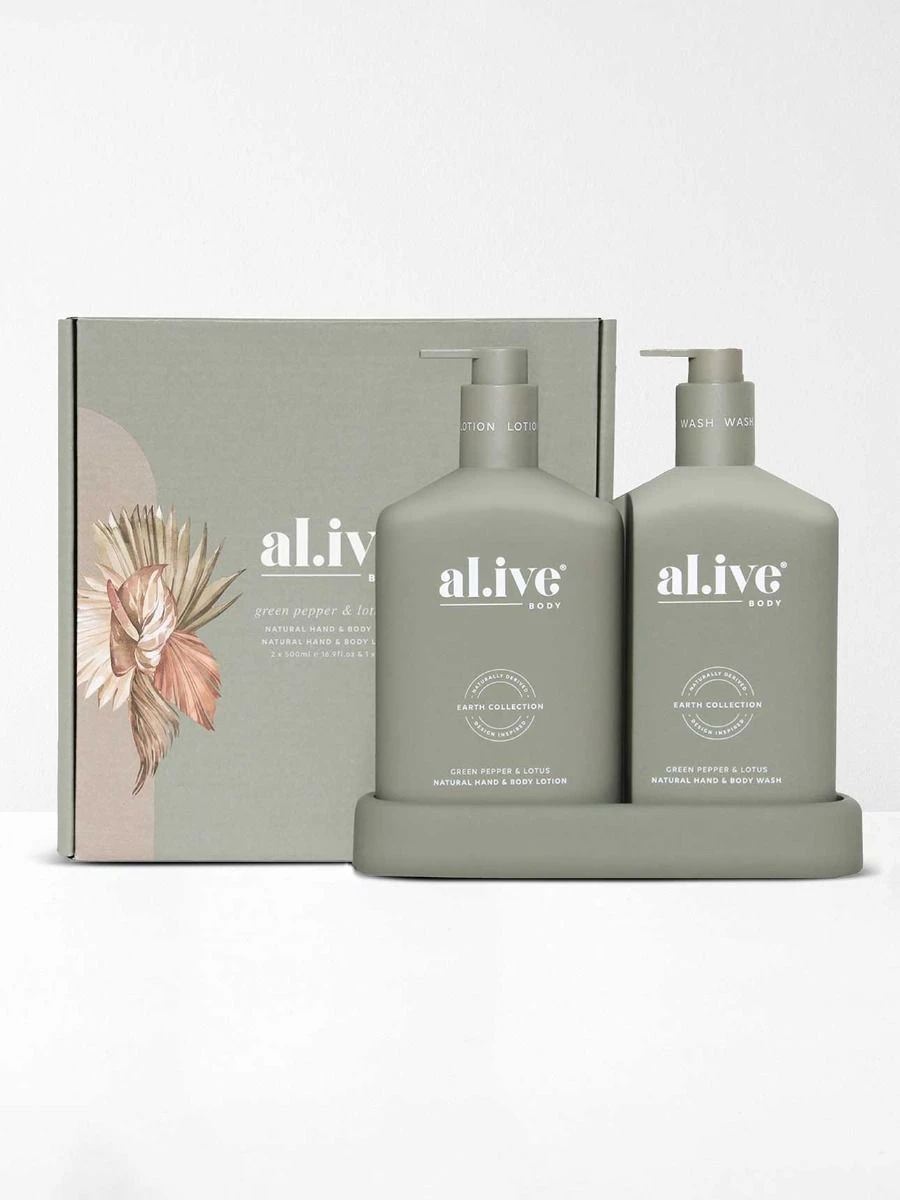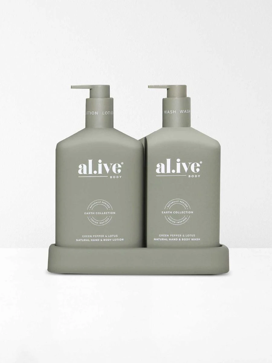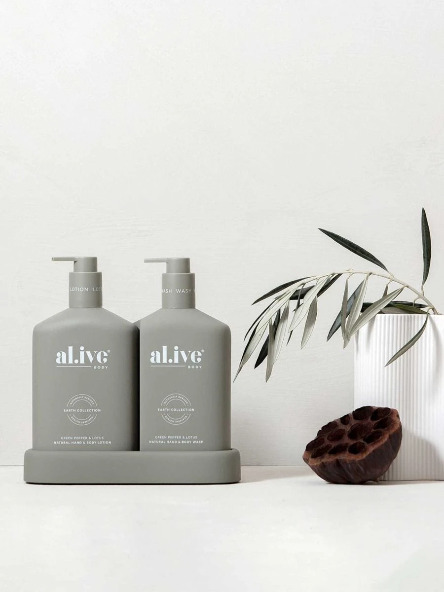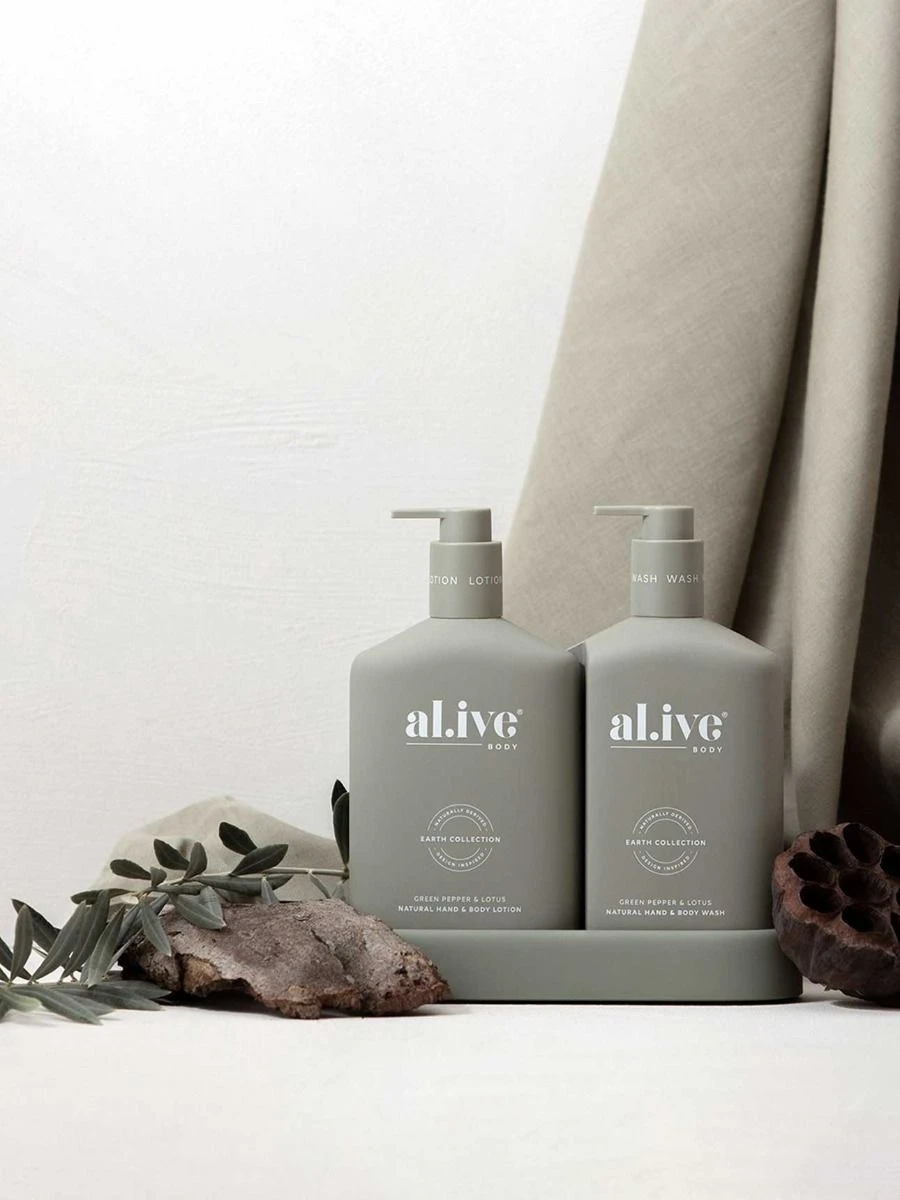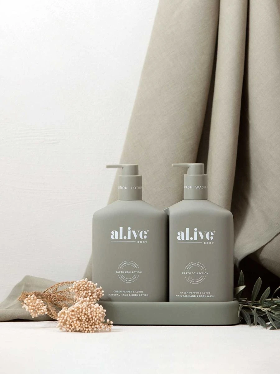 The al.ive body Green Pepper & Lotus Hand & Body Wash/Lotion Duo contains a luxurious blend of naturally derived ingredients, fortified with essential oils and native botanical extracts.