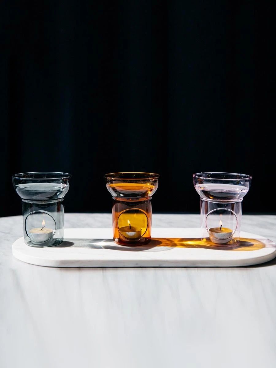 Maison Balzac invites you to a silent perfume ceremony thanks to three simple steps: Gently pour fresh water into the circular recipient, half level is perfect, and delicately add five drops of their oil burner blend of your choice. The ignition of the tea light will provide the gentle warmth to infuse the aromatic. Made from heat resistant coloured glass, each oil burner comes with an Australian beeswax candle.