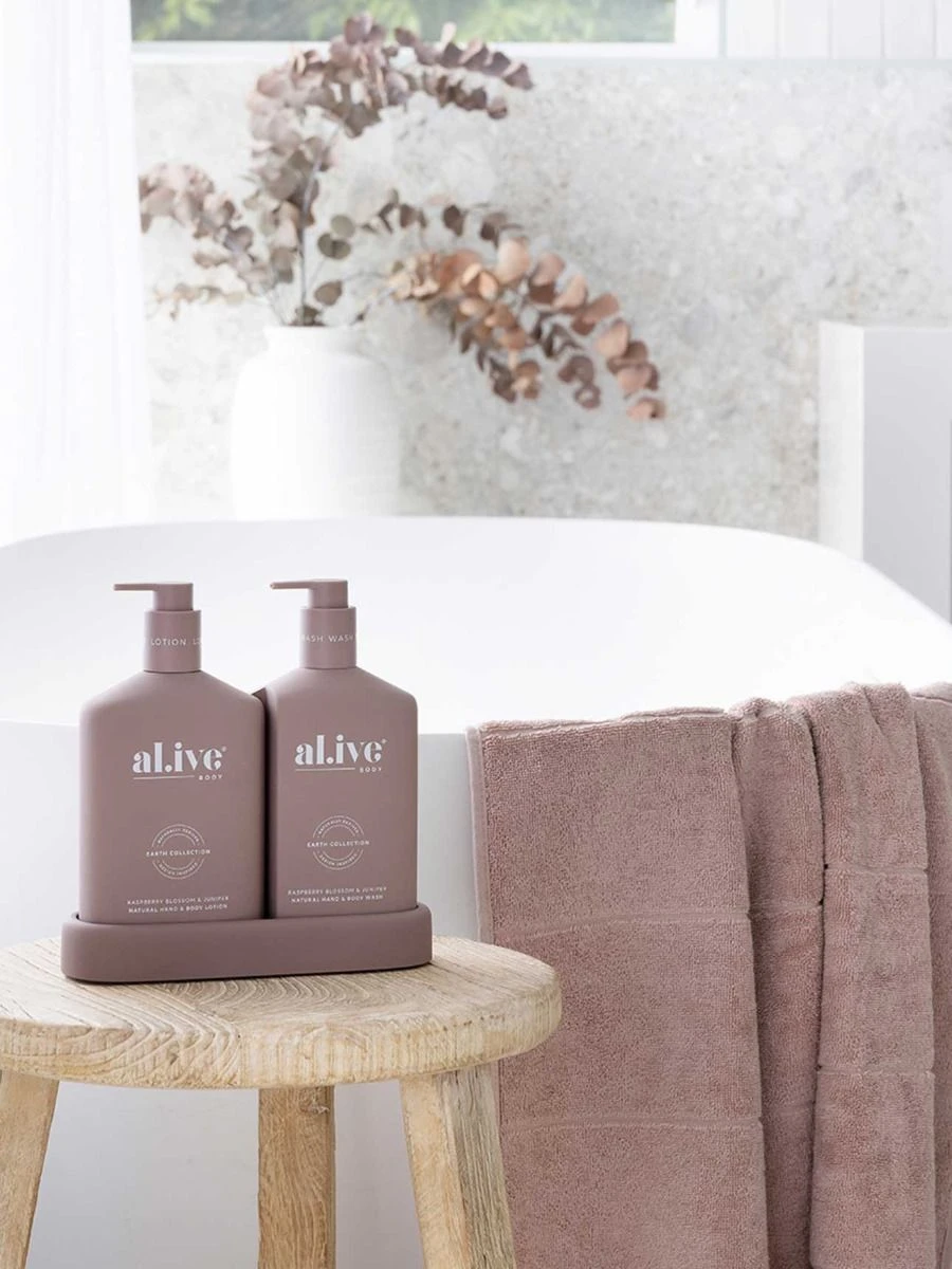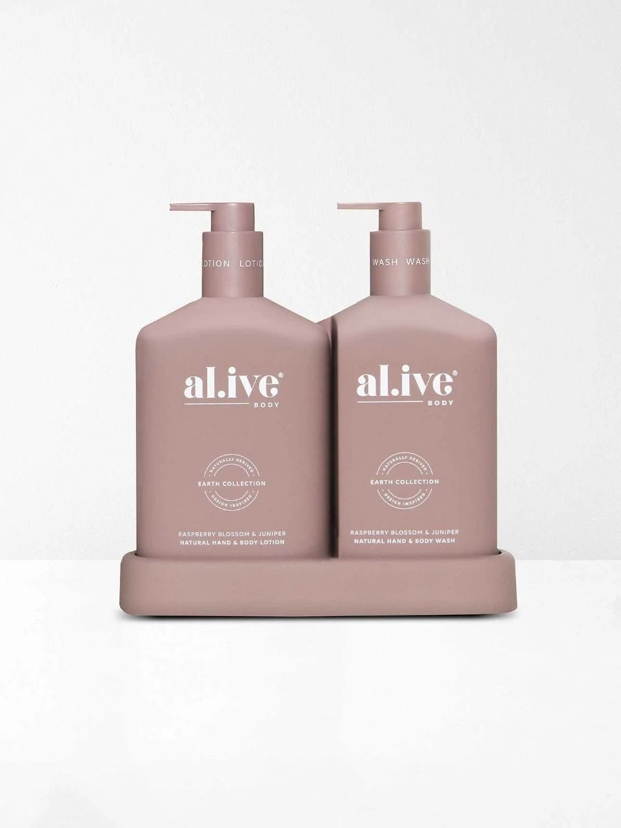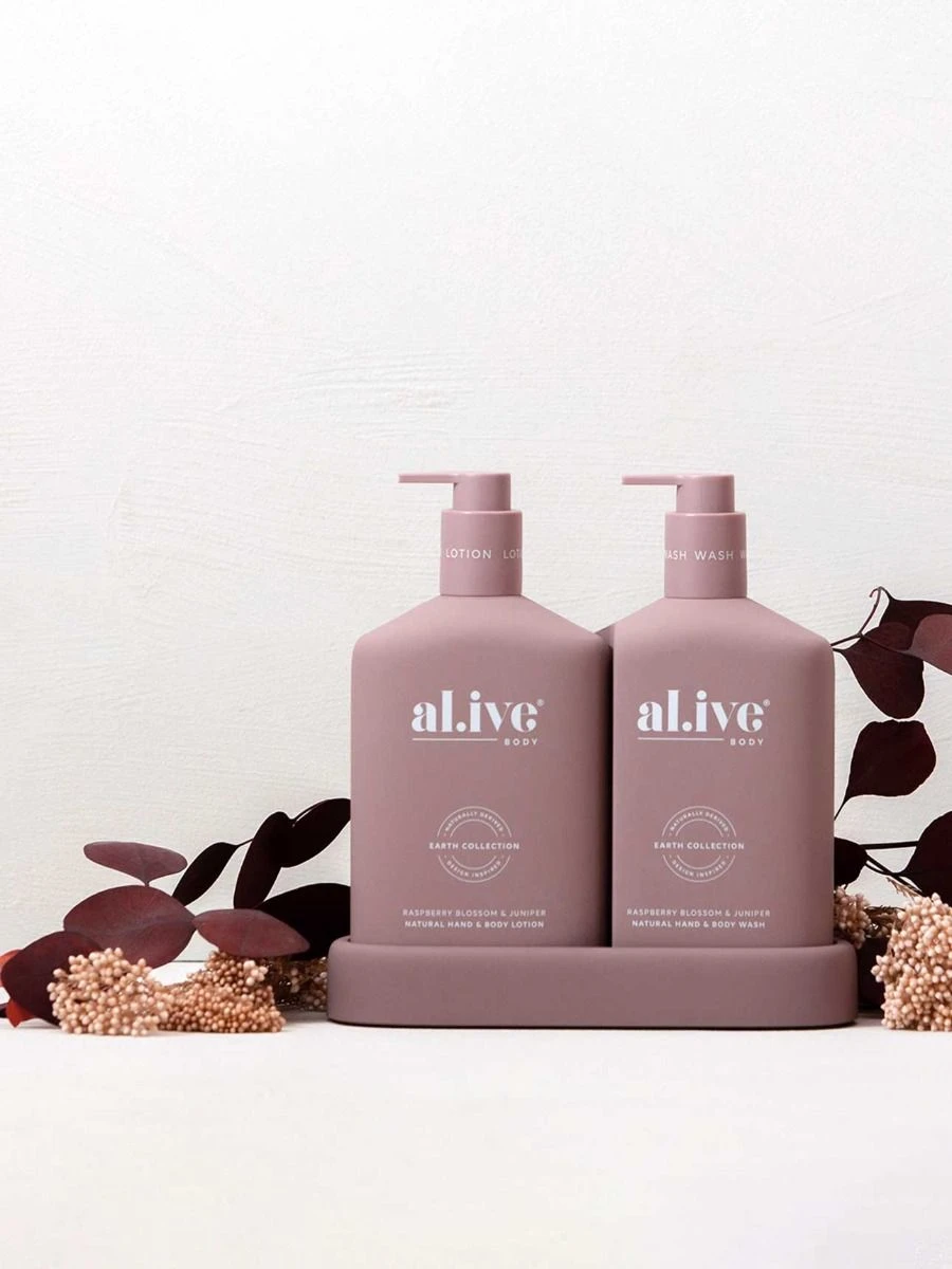 The al.ive body Raspberry Blossom & Juniper Hand & Body Wash/Lotion Duo contains a luxurious blend of naturally derived ingredients, fortified with essential oils and native botanical extracts.